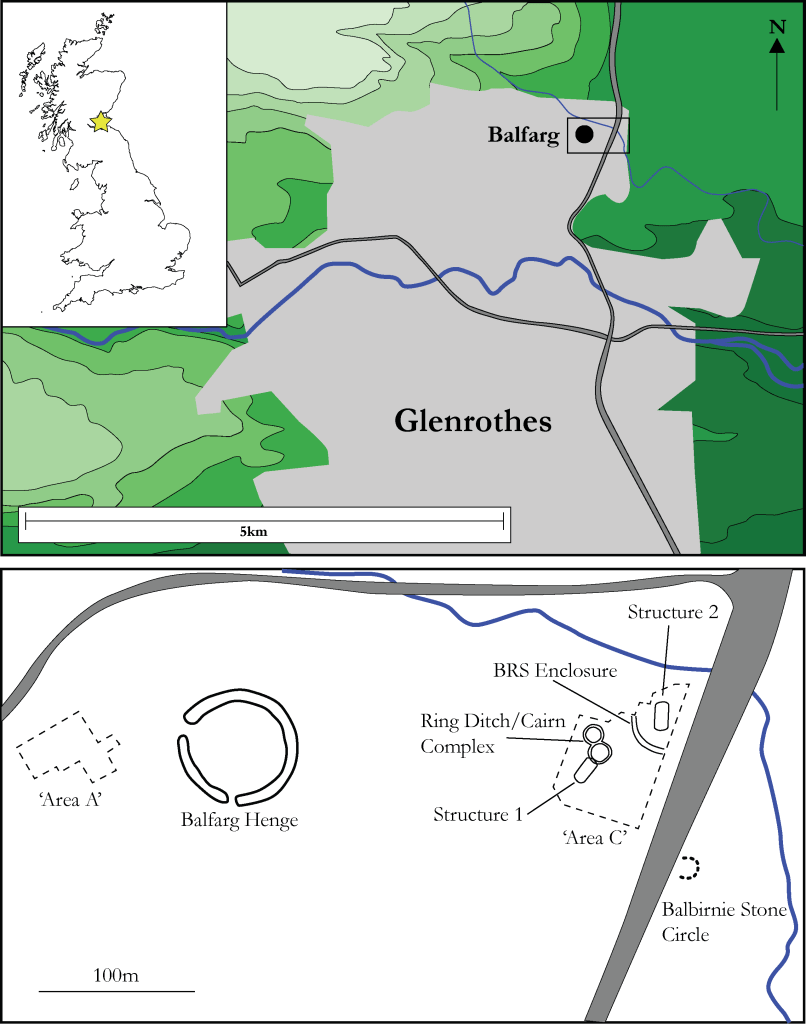 The Balfarg/Balbirnie complex is located in Fife, to the north of Glenrothes and the River Leven. It is made up of three main sites, the Balbirnie stone circle and cairn, the Balfarg Henge, and the Balfarg Riding School enclosure and associated features, which were excavated in detail during the 1970’s and 1980’s. Each site is described below, however, this project will focus on Balfarg Riding school, as the Balfarg Henge has no suitable samples for further radiocarbon measurements, and Alex Gibson has recently presented new radiocarbon measurements, and a revised chronology, for Balbirnie Stone Circle (see further reading).