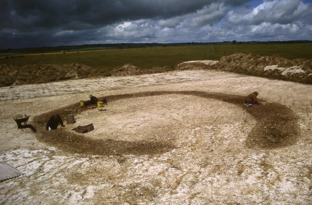 The first site at Wyke Down to be excavated was Wyke Down 1 ‘henge’, which was originally identified from aerial photographs, and interpreted as a ploughed-out round barrow. On stripping away the overlying ground surface, 26 pits cut into the chalk were uncovered in four distinct arcs, making up an enclosure 19.5m x 17m, with an entrance to the south, and a pit at the centre. Each pit ranged in depth from 1.05 and 2m, with the deepest pits found at the entrance and towards the back of the monument. It is possible that the spoil produced by the original excavation of the pits may have been used to create an external bank, as seen on other ‘henge’ monuments in Britain and Ireland, however, no remains of a bank was identified.