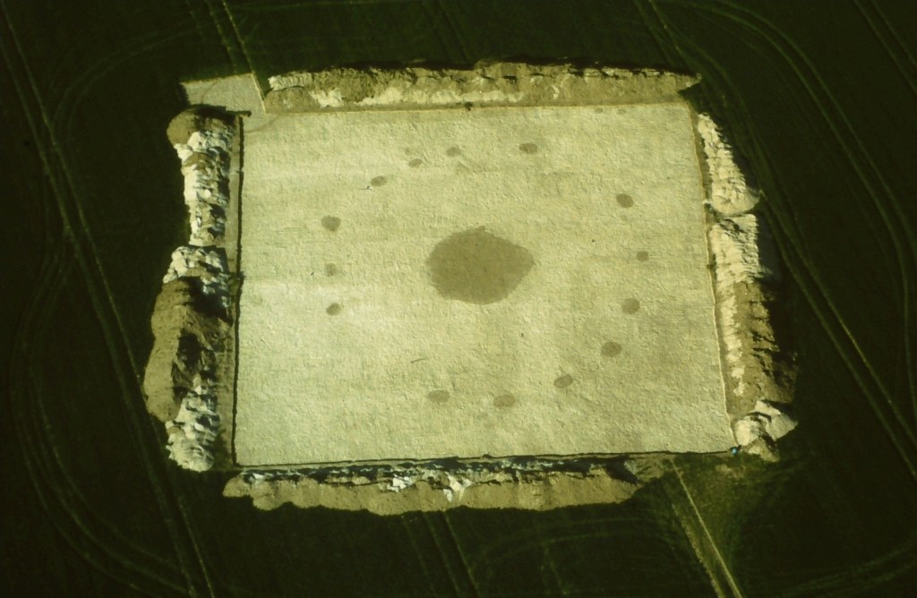 First discovered by Martin Green in aerial photographs in 1996, and excavated in 1997, the Monkton-Up-Wimborne pit circle and shaft complex is located on a chalk ridge on the eastern side of the Upper Allen Valley, c1.5km to the east of Fir Tree Field, and just over 1km south-east-east from Wyke Down. It is made up of a ring of 14 pits in a circle, with a diameter of c.35m, and wide entrance gaps on the eastern and western side of the circle. This pit circle surrounded a central pit (F.1), 11m wide and 1.5m deep, with vertical sides and a notably even and smooth base, the result of the original excavators stopping at a band of natural solid chalk. The excavators suggested that the spoil created may have been used to create a bank running around the central pit (however, no trace of any upstanding bank has survived). The next evidence of activity after F1 was the digging of a small pit (F.23) in the northern side of F1, undercutting the edge. This pit contained four crouched inhumations, including an adult female and three children, and was carefully backfilled with packed chalk rubble.
